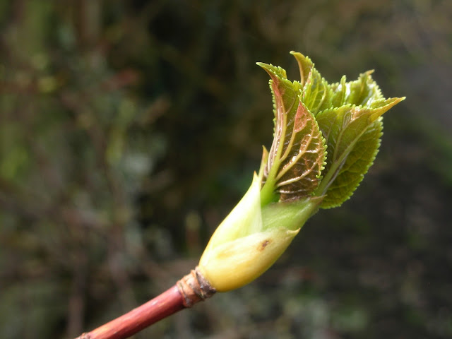 Bursting into leaf already is a lovely Hydrangea anomala subsp petiolaris - the climbing hydrangea. Situated on the north facing fence, it grows incredibly well and produces huge attractive flowerheads each year. Even during the winter when all the laves have fallen, this plant manages to look appealing with its red/brown peeling bark and framework of stems. Last spring it took a bit of a battering when the chickens took a fancy to the leaves and totally stripped the lower third - basically to the height that they could jump...